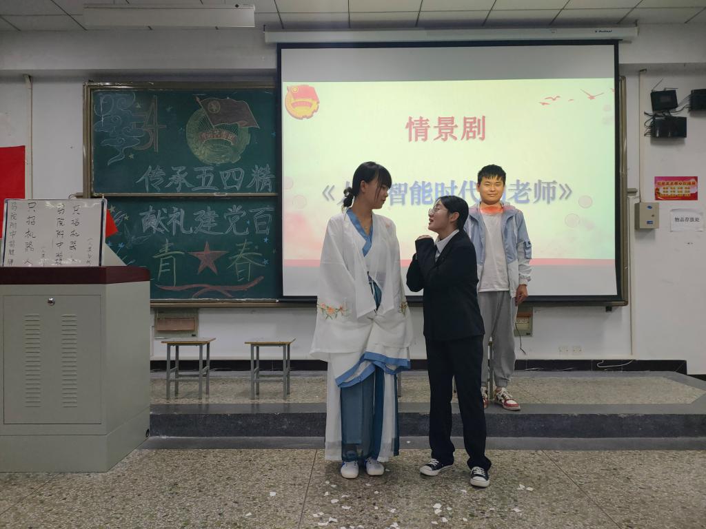 线下团日学习中,同学们以热情高涨,慷慨激昂的团歌和入团誓词表达了一心向团向党的初心和信念,同时集中学习了五四历史、中国共产党党史和“十四五”规划。杨慧丽、郝春天、杨玉桐、张睿臻、王凯杰五名同学带来的朗诵《五四的火焰》发人深省,号召青年人以民主、科学、爱国、进步之姿,吹响时代的号角,引发了同学们关于青春责任担当的反思;白思宇、王博宇等同学演绎情景剧《人工智能时代的老师》,将人工智能与五四爱国、进步精神相结合,深刻的展示出了在人工智能发展大势下,青年教师应该承担的责任和担当,获得同学们的一致好评。最后江林壑同学作为疫情防控优秀志愿者代表开展志愿宣讲,激励永利官网团员青年胸怀祖国,志存高远,积极投身社会志愿服务之中发光发热。