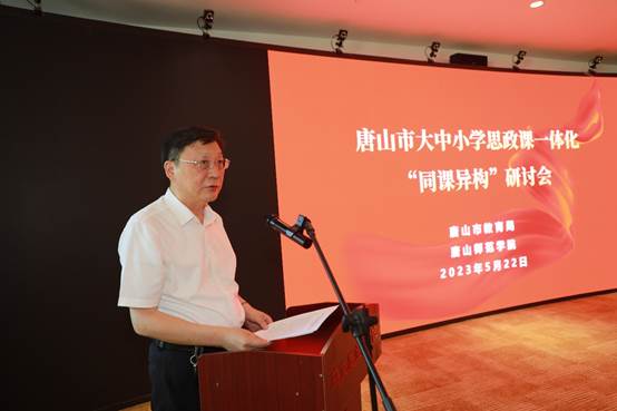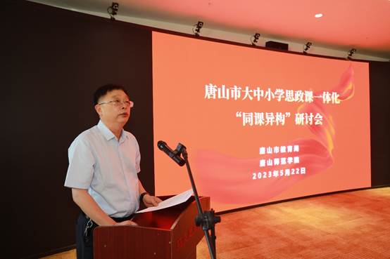 为进一步推进唐山市大中小学思政课一体化建设,促进大中小学思政课教育教学方法有序衔接,5月22日我校与唐山市教育局在北院VR虚拟教学体验中心联合举办唐山市大中小学思政课一体化“同课异构”研讨会。来自全市多所大中小学的七十多名思政课骨干教师参加研讨会。唐山师范学院副院长杨涛、唐山市教育局二级调研员李连斌出席研讨会并讲话。yl6809永利官网执行院长宋晓敏主持会议。