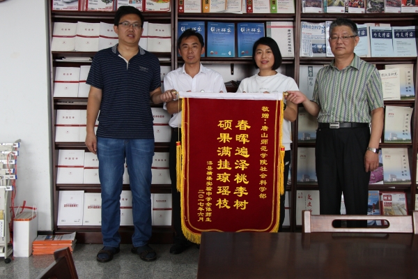 社会科学部2014级思想政治教育本科班崔丽、杨颖两位同学到滦县横渠实验中学进行顶岗实习,两位同学在实习期间工作认真、勤奋好学、踏实肯干,高质量的完成了实习任务,得到了横渠实验中学领导、师生的一致好评。2017年6月19日,横渠实验中学王猛校长和年级主任周丽丽老师来到唐山师范学院社会科学部赠送锦旗,社会科学部吴文华主任、王学增书记亲手接过锦旗并表示了感谢。